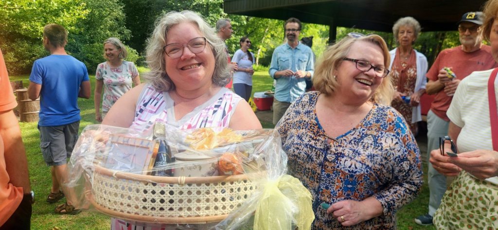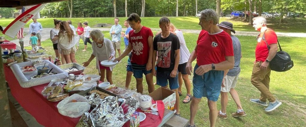 Our Grill Master Adam Filipiak took care of kielbasa, and everyone enjoyed the variety of food brought to the table – snacks, side dishes including pierogi, salads, desserts, fresh fruits and vegetables. Thank you to everyone who contributed to the potluck! Our younger generation, after playing games at the table, took advantage of the river to cool off and AAPA proudly presented new banner with the logo of the organization. We had traditional raffle where the main prize was Polish basked of the value of $80, arranged by AAPA Board Members. This time the lucky winner was Mr. Jerzy Petryniak – congratulations! After the raffle, groups gathered around tables to catch up and share stories with Polish music in the background.
